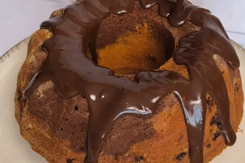 4. Pecite kuglof u prethodno zagrejanoj rerni na 180°C oko 50 minuta. Nakon pečenja ostavite da se ohladi na sobnoj temperaturi, pa ga pažljivo istresite iz kalupa na tacnu. Prelijte otopljenom crnom čokoladom i poslužite ga.