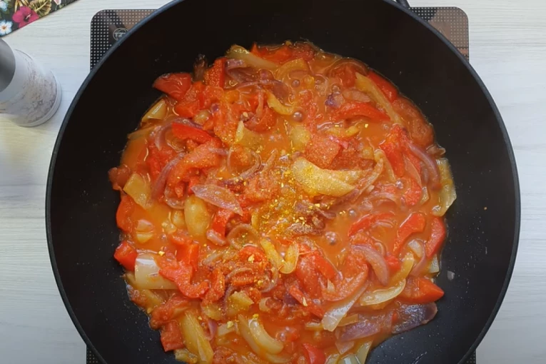 1. Paprike operite, očistite i isecite na trakice. Crveni luk sitno naseckajte. U velikoj šerpi zagrejte ulje, dodajte luk i pržite ga dok ne postane staklast. Zatim dodajte paprike i dinstajte ih na tihoj vatri oko 20 minuta, uz povremeno mešanje. U međuvremenu, oljuštite paradajz i iseckajte ga sitno. Kada paprike omekšaju, dodajte paradajz, so, biber i alevu papriku. Kuvajte dok se sve lepo ne sjedini i dok višak tečnosti ne ispari, otprilike još 20 do 30 minuta, dok se sos ne zgusne.