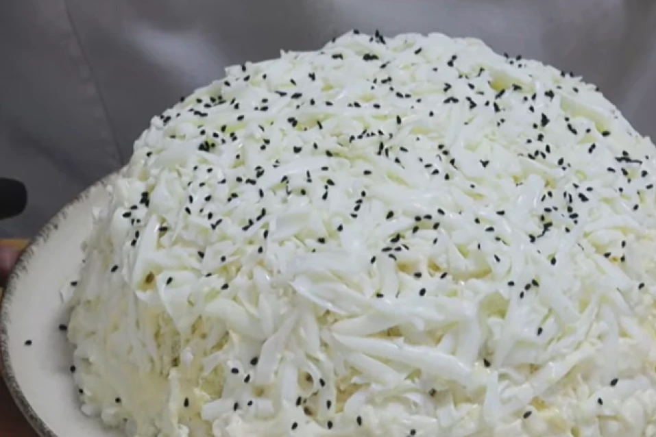 3. Na kraju dodajte rendani tvrdi sir i po potrebi još malo majoneza kako bi salata bila sočna i kompaktna. Površinu lepo zagladite i pospite crnim susamom. Ostavite salatu u frižideru najmanje sat vremena pre služenja kako bi se svi ukusi povezali u savršenu celinu.