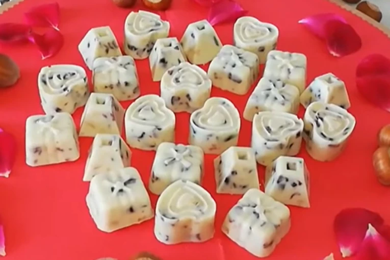 3. Ostavite u frižideru oko sat vremena da se dobro stegne. Kada se smesa stvrdne, izvadite iz pleha i isečite na kvadratiće ili željene oblike. Ako je smesa previše tvrda, ostavite je na sobnoj temperaturi 15 minuta pre sečenja.