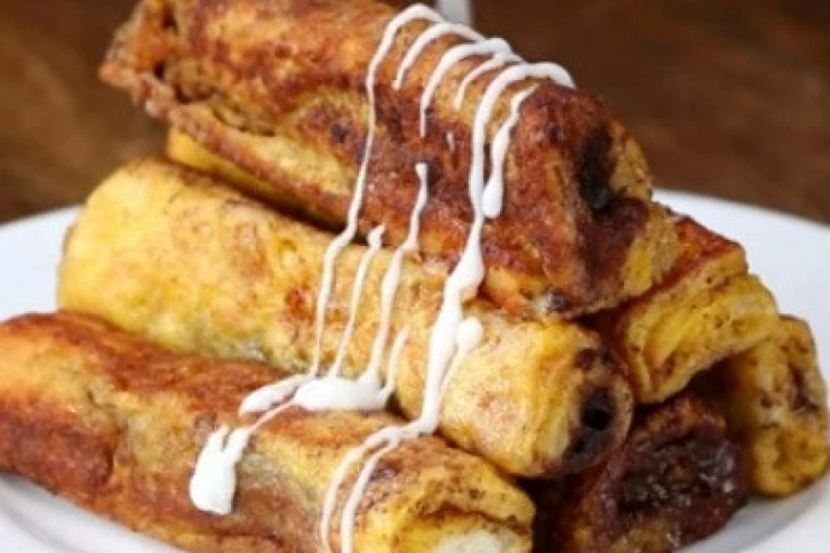 3. U činiji pomešajte jaja, mleko, pola kašičice cimeta i vanilu. Svaki rolat umočite u mešavinu jaja i pržite u tiganju sa maslacem dok sve strane ne porumene.