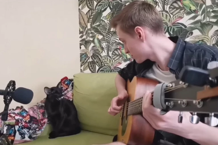 Njegov vlasnik, muzičar, rado svira taktove bluza na svojoj gitari, dok ovaj crni mačak sedi pored njega i prati ga u ritmu.