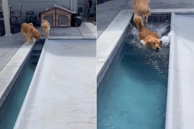 Prvo plivanje ove godine: Retriveri jedva dočekali da vlasnik otvori bazen, pa odmah odlučili da isprobaju vodu (VIDEO)