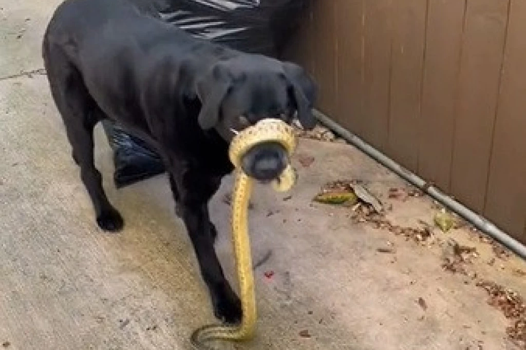 U snimku se vidi kako pas prilazi sa zmijom obmotanom oko njuške.