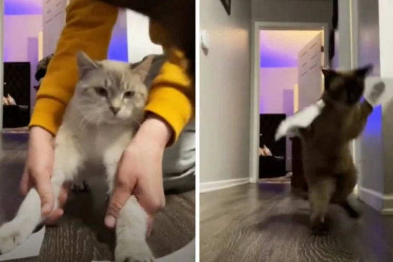 Ona je na šapice svojih mačaka stavila lepljivi papir. Kako bi se rešile neobičnog materijala, mačke su se podigle na zadnje noge, a prednjima zatresle, kao da pokušavaju da polete.