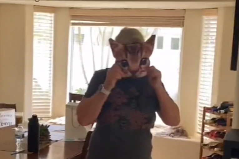 Na TikTok profilu Tare Konlin objavljen je snimak žene koja na glavu stavlja jastuk/masku s likom mačke. Potom prilazi svojim ljubimicama koje leže na podu.