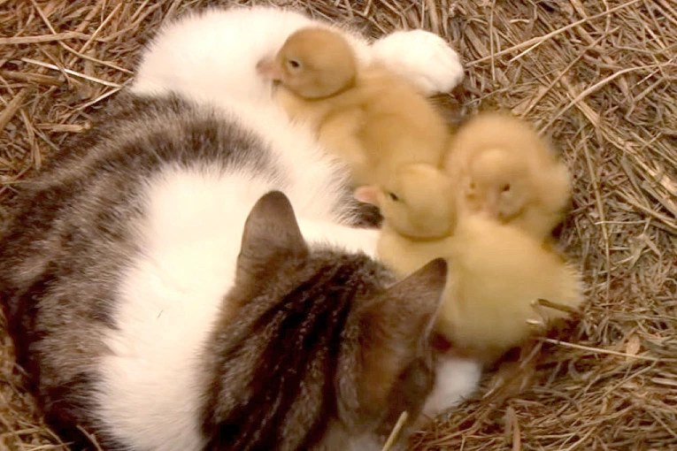 Mačka je dobila mačiće nekoliko sati pre nego što su se pačići izlegli, pa su hormoni i majčinski instinkt preovladali. Maca je rešila da ih usvoji i greje da se ne smrznu u hladnoj štali kao da su njeni mladunci.