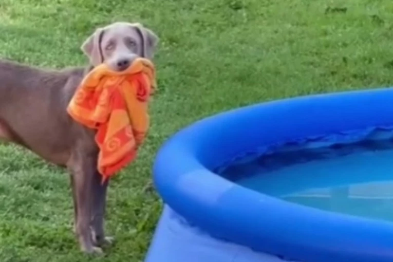 Pas Okli nasmejao je korisnike TikToka nakon što je njegova vlasnica objavila video u kojem stoji ispred dečjeg bazena, a u zubima drži peškir.