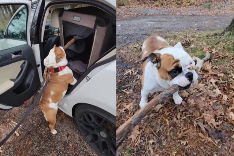 U snimku koji je objavljen na društvenoj mreži Instagram se vidi ovaj presimpatičan bucko kako pokušava da ugura ogroman štap u kola svoje vlasnice i ponese ga kući.