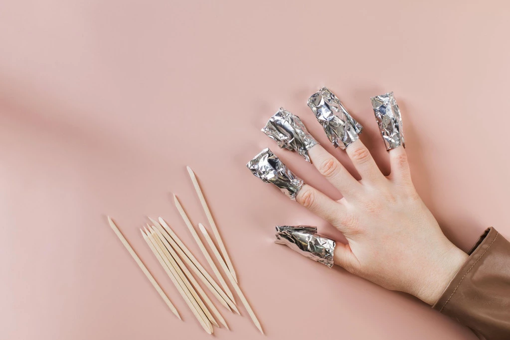 Skidanje trajnog laka započnite turpijanjem površnite, da biste skinuli sjaj, zatim na vaticu stavite aceton (dakle, ne uljani aceton, već baš aceton), a nakon toga sve to zajedno stavite na nokat i obmotajte ga aluminijumskom folijom. Uradite to tako da sjajna strana bude unutra. Držite sve to na noktima nekih 15-ak minuta, nakon čega bi, ukoliko ga pogurate drvenim štapićem, trebalo da se skine bez problema.