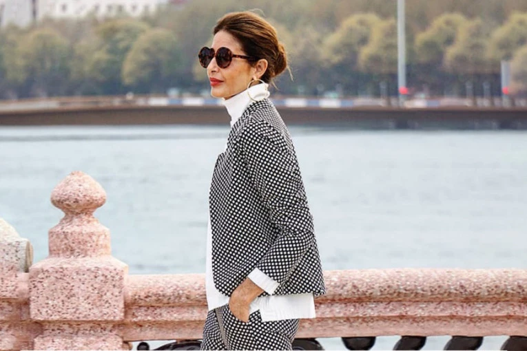 Elegantna age+ blogerka bira tufne, sjajno kombinuje žensko odelo s efektnim tačkama u crno-beloj kombinaciji s belom dolčevitom i crnim gležnjačama na petu.