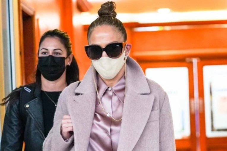 Džej Lo se pojavila u satenskom kompletu, tačnije pantalonama i košulji, a preko je obukla kaput. Sve je bilo u nijansama prljavo roze, a uz ovu kombinaciju obula je patike.