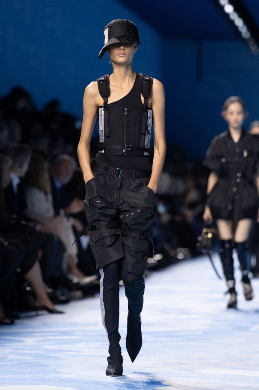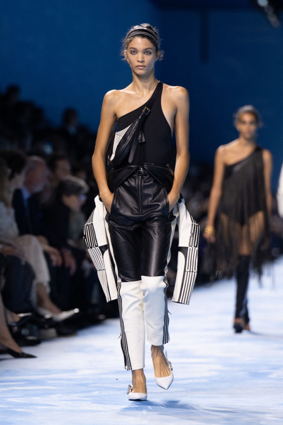 Manekenke su marširale niz dugi, ravan podijum, paradirajući u haljinama nalik dresu, asimetričnim bodijima i crnim pantalonama sa belim trkačkim prugama koje su se protezale duž nogu.