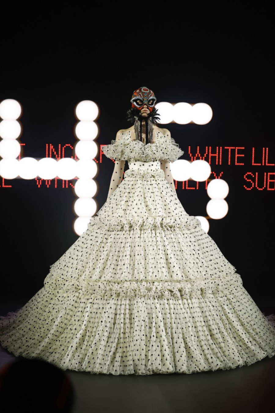 Mikele je inspiraciju za ovu kolekciju crpeo iz različitih epoha i kulturnih uticaja. Tjudorski stil piramidalnih haljina, osamnaestovekovne suknje i teatralne siluete evocirale su slike sa istorijskih dvorskih prijema, dok su bogati detalji i slojeviti materijali doneli modernu interpretaciju klasične visoke mode.
