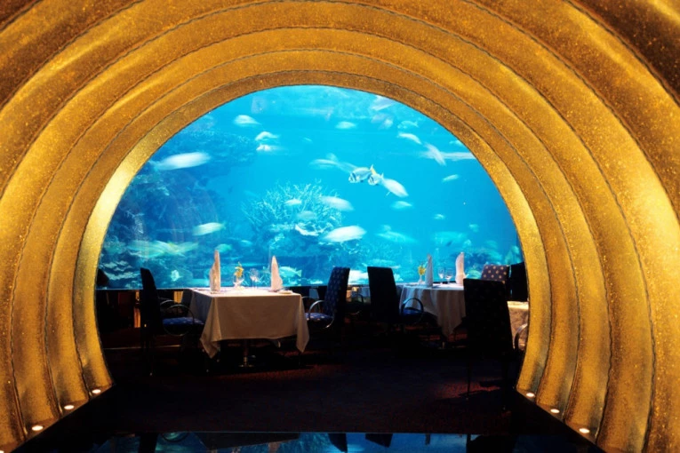 Večerati u staklenom okruženju, od poda do plafona, može biti pomalo zastrašujuće. Jer dok vi jedete, pored vas će plivati egzotični primerci morskih životinja a vi ćete se osećati kao sirena.