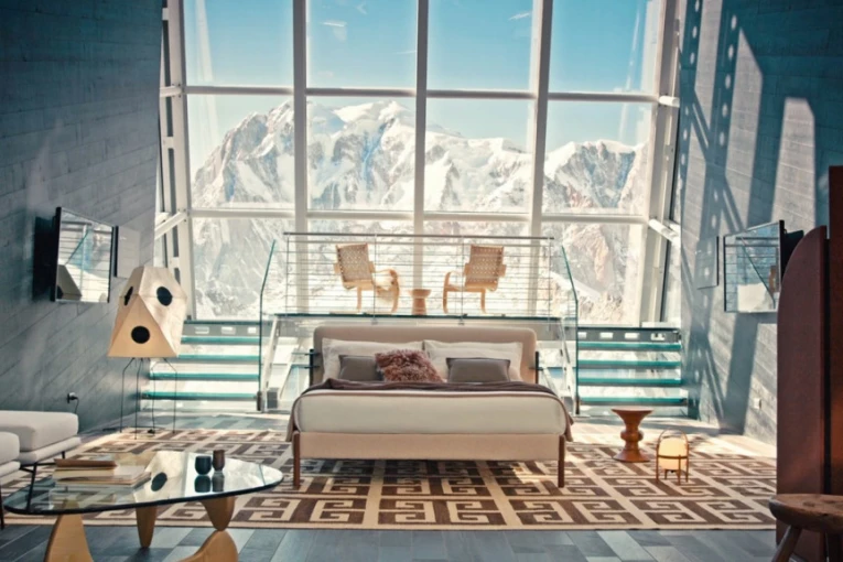 Spavaće u sobi koja je opremljena skupocenim nameštajem i sa spektakularnim pogledom jer je cela prostorija u staklu, od poda do plafona. U cenu je uračunata i specijalna večera u „Tavolo dell’infinito“ na stanici žičare Punta Helbroner.