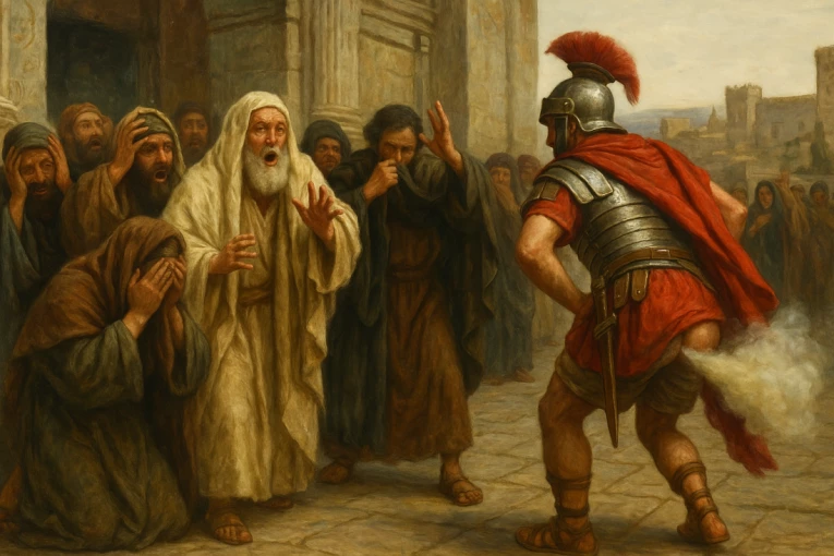 Prema zapisima jevrejskog istoričara Flavija Josifa, rimski vojnici obezbeđivali su hram u Jerusalimu tokom velikog verskog praznika. Okupljena masa bila je brojna i napeta, a onda je jedan vojnik odlučio da „zabavi“ okupljene na najneprimereniji način – zadigao je tuniku i ispustio glasni prdež u pravcu naroda.