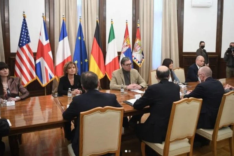 - Predsednik Srbije Aleksandar Vučić razgovarao je danas sa ambasadorima zemalja Kvinte i šefom Delegacije EU u Srbiji o brojnim pitanjima. Sve informacije o stavovima koje su strane iznele biće objavljene u narednih 36 sati - navedeno je na instagram profilu "budućnostsrbije", uz fotografije sa susreta.