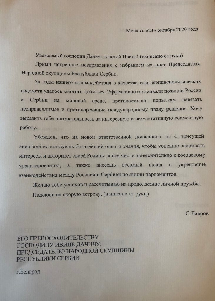 Još jedna potvrda čvrstog prijateljstva: Bocan-Harčenko uručio Dačiću ručno pisanu čestitku Lavrova