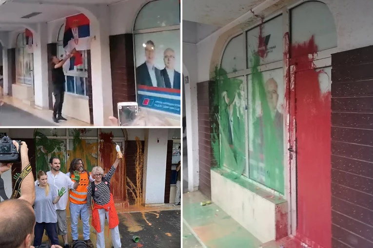 Divljanje Borinih pulena i lažnih ekologa: Razbijen izlog, bačena farba i skinute srpske zastave sa prostorija SNS-a (FOTO/VIDEO)