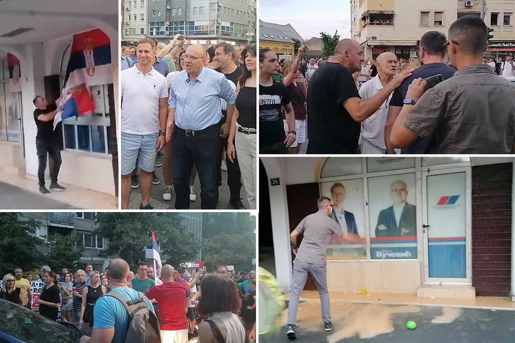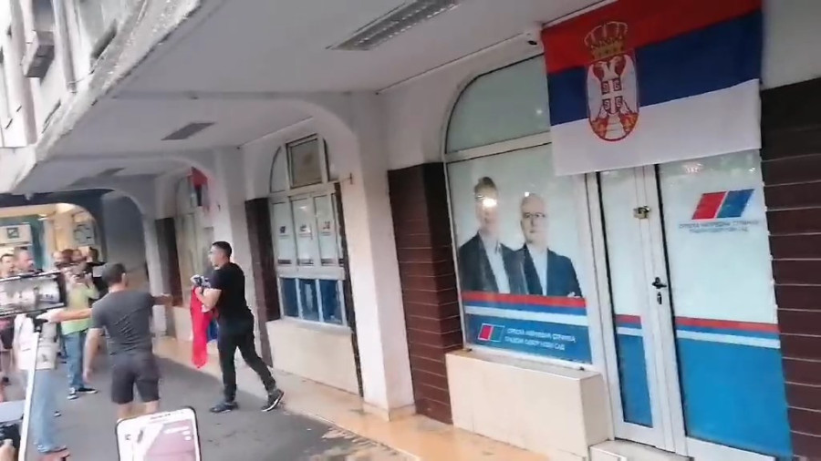 Kako dalje navode, prethodno su lažni ekolozi došetali do prostorija SNS-a na Bulevaru oslobođenja, da bi izazvali incident. Okupljeni su jajima gađali prostorije, ali i krvnički razbili stakla na prostorijama ove stranke. Zelenom i crvenom bojom jedan od okupljenih oskranavio je izlog, uz pokliče okupljene mase. Vrhunac svega bilo je skidanje srpske zastave sa prostorija i njeno cepanje!