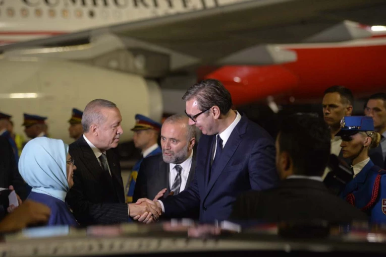 Turski predsednik je u Beograd doputovao sa brojom delegacijom, u kojoj se nalazi i šef diplomatije Turske Mevlut Čavušoglu, a iz aviona je izašao sa suprugom Emine.