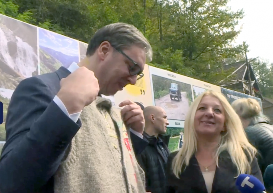 Najviše aplauza danas je u ivanjičkom kraju pobrala jedna gospođa koja je predsedniku Vučiću poklonila vuneni prsluk sa izvezenim grbom Srbije i njegovim potpisom.