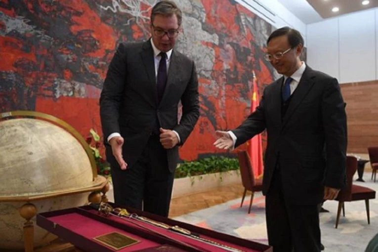 Predsednik Srbije Aleksandar Vučić poklonio je danas svom gostu iz Kine Jangu Điječiju sablju sa ugraviranim rečima “Ne vadi me bez povoda, ne vraćaj me bez časti”.