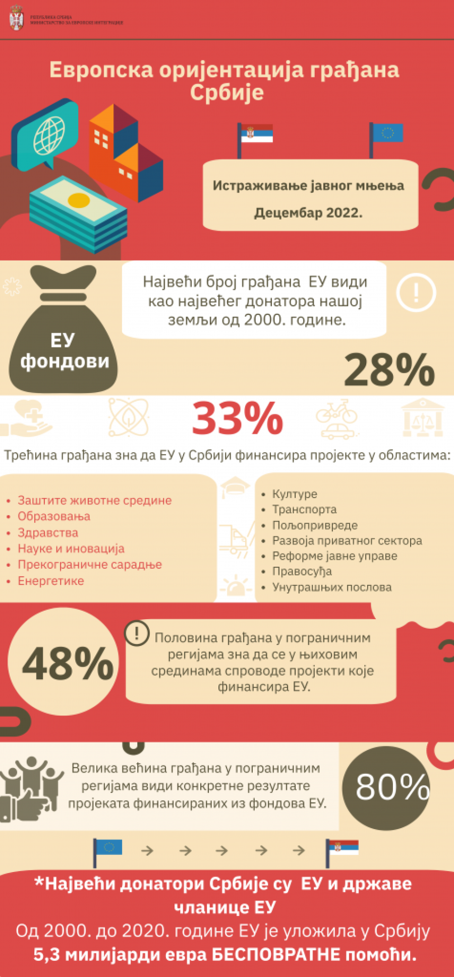 Trećina ispitanika upoznata je sa činjenicom da se u Srbiji sprovode projekti finansirani EU sredstvima, posebno u oblastima zaštite životne sredine, obrazovanja, zdravstva, nauke i inovacija, prekogranične saradnje, energetike, kulture, transporta, poljoprivrede, razvoja privatnog sektora, reforme javne uprave i pravosuđa i unutrašnjih poslova. U pograničnim oblastima taj procenat je mnogo veći jer čak polovina ispitanika (48 odsto) zna da se u njihovim sredinama sprovode projekti u okviru prekogranične saradnje, a više od 80 odsto njih se u potpunosti ili delimično slaže da vide konkretne rezultate sprovođenja ovih projekata finansiranih iz fondova Evropske unije.