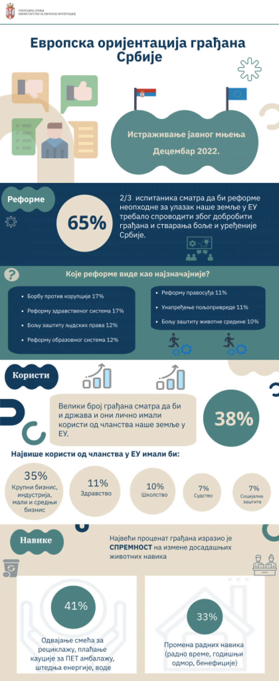 Podrška građana reformama je, kao i prethodnih godina, ostala visoka. Od ukupnog broja ispitanika, dve trećine (65 odsto) smatra da bi reforme neophodne za ulazak naše države u EU trebalo sprovoditi, zbog dobrobiti građana i stvaranja bolje i uređenije Srbije.