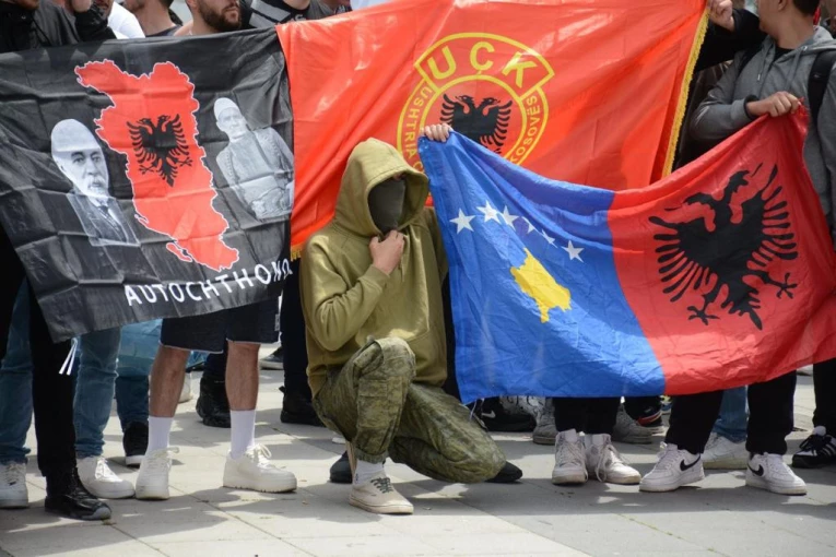 Demonstranti uzvikuju "UČK, UČK", uz istaknute zastave velike Albanije i tzv. OVK.