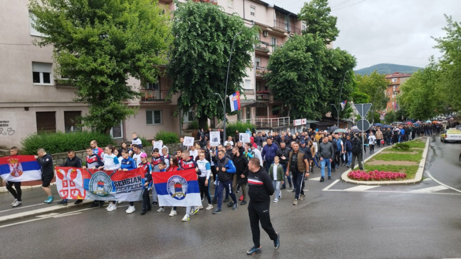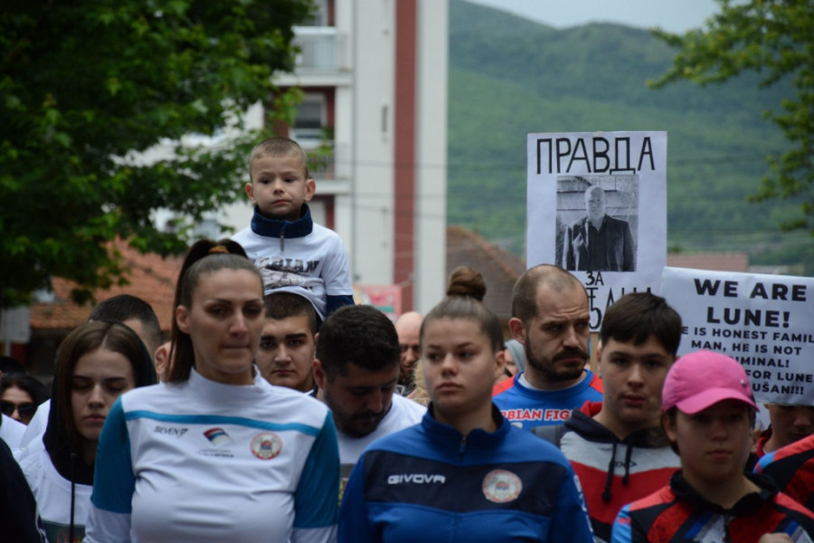 U protestu ih nisu sprečili loše vreme i kiša, a kolonu predvode deca, sportisti kik boks kluba "Kosovska Mitrovica" čiji je Lune trener, kao i prijatelji i porodice uhapšenih Srba.
