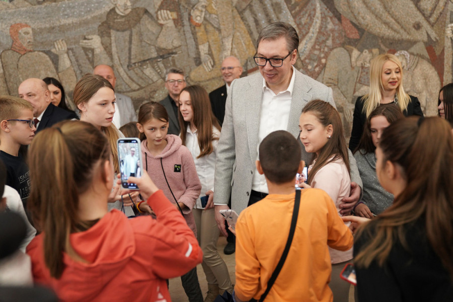-Draga deco mnogo sam srećan što vas vidim ovde u Beogradu, drago mi je da ste mogli da posetite Studenicu i Žiču, ali i Hram Svetog Save i obiđete institucije Srbije. Srećan sam što imate divne nastavnike, vaspitače koji vas štite i uče, već vam nedvosmisleno govore kakva je budućnost pred vama, šta je to što treba da znate da biste doprineli svojoj državi. Nastavićemo koliko je u gotovo nemogućim uslovima moguće, da ulažemo u vaš napredak. Za muzički kabinet koji vam je poteban, za koji ste me pitali, računajte da je rešeno. To je sitnica, u prethodne tri godine smo uradili potpuno nove tri škole i pet vrtića i obnovili 29 škola. Vašim roditeljima sam zahvalan što u teškim uslovima, progona, maltretiranja, znaju da imaju samo jednu zemlju. Hvala vam draga deco što volite svoju zemlju i što ćete svojim znanjem doprineti napretku Srbije, rekao je Vučić obraćajući se prisutnima.