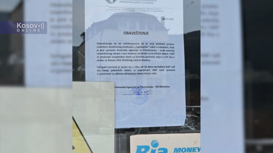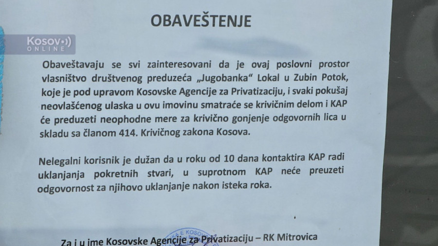 - Nelegalni korisnik je dužan da u roku od 10 dana kontaktira KAP radi uklanjanja pokretnih stvari - piše između ostalog u obaveštenju nalepljenom na vratima ekspoziture Banke Poštanske štedionice u Leposaviću.