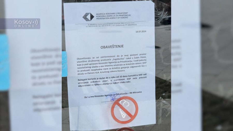 Na vratima je postavljeno upozorenje da "je taj poslovni prostor pod upravom Kosovske agencije za privatizaciju i da će se svaki pokušaj nelegalnog ulaska smatrati krivičnim delom".
