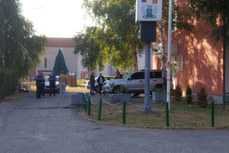 Ispred opštine se nalaze pripadnici tzv. kosovske policije sa policijskim džipovima.