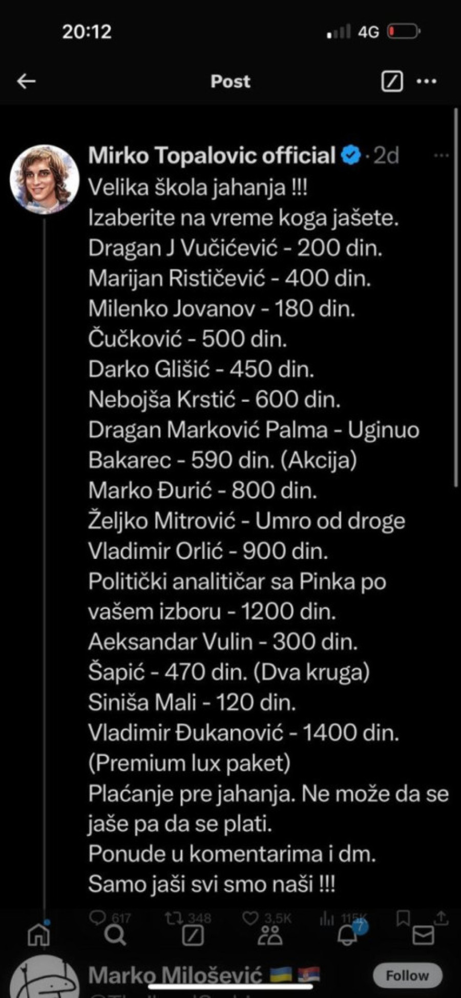 "Jahanje popova" i "huliganstvo preko X" izgleda idu ruku podruku, ovaj put u modifikovanoj verziji zvanoj "jahanje političkih neistomišljenika", ali i novinara, poznatih ličnosti, pripadnika državnog vrha i svih drugih koji ne ljube skute prozapadnoj opoziciji.