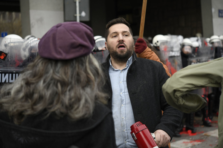 09.35 - Ulica Žarka Zrenjanina ispred zgrade je blokirana. Okupljeni sve vreme duvaju u pištaljke i vuvuzele, a među njima su opozicioni političari Pavle Grbović, Janko Veselinović, Miša Bačulov, Vladimir Štimac, Borislav Novaković.