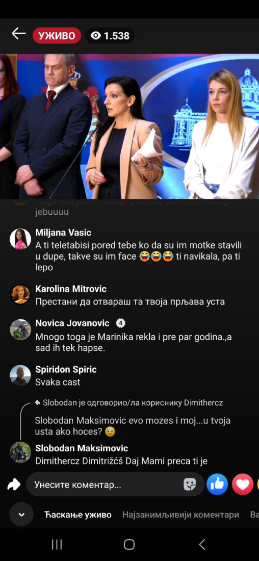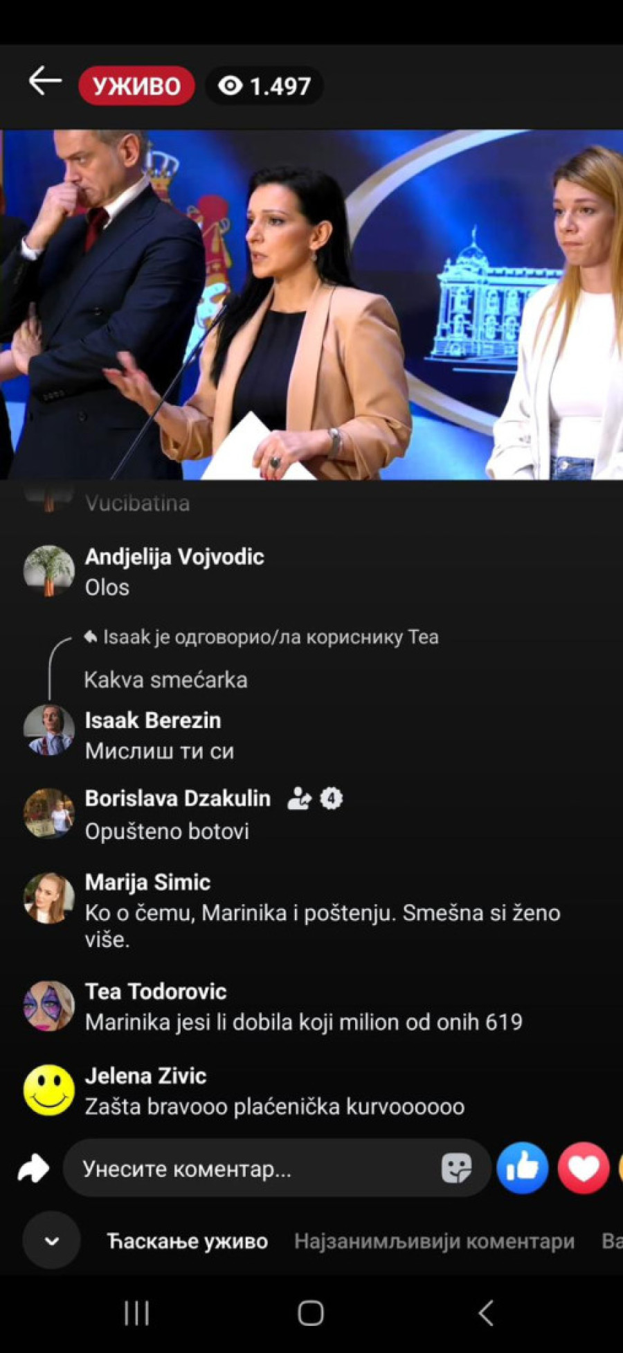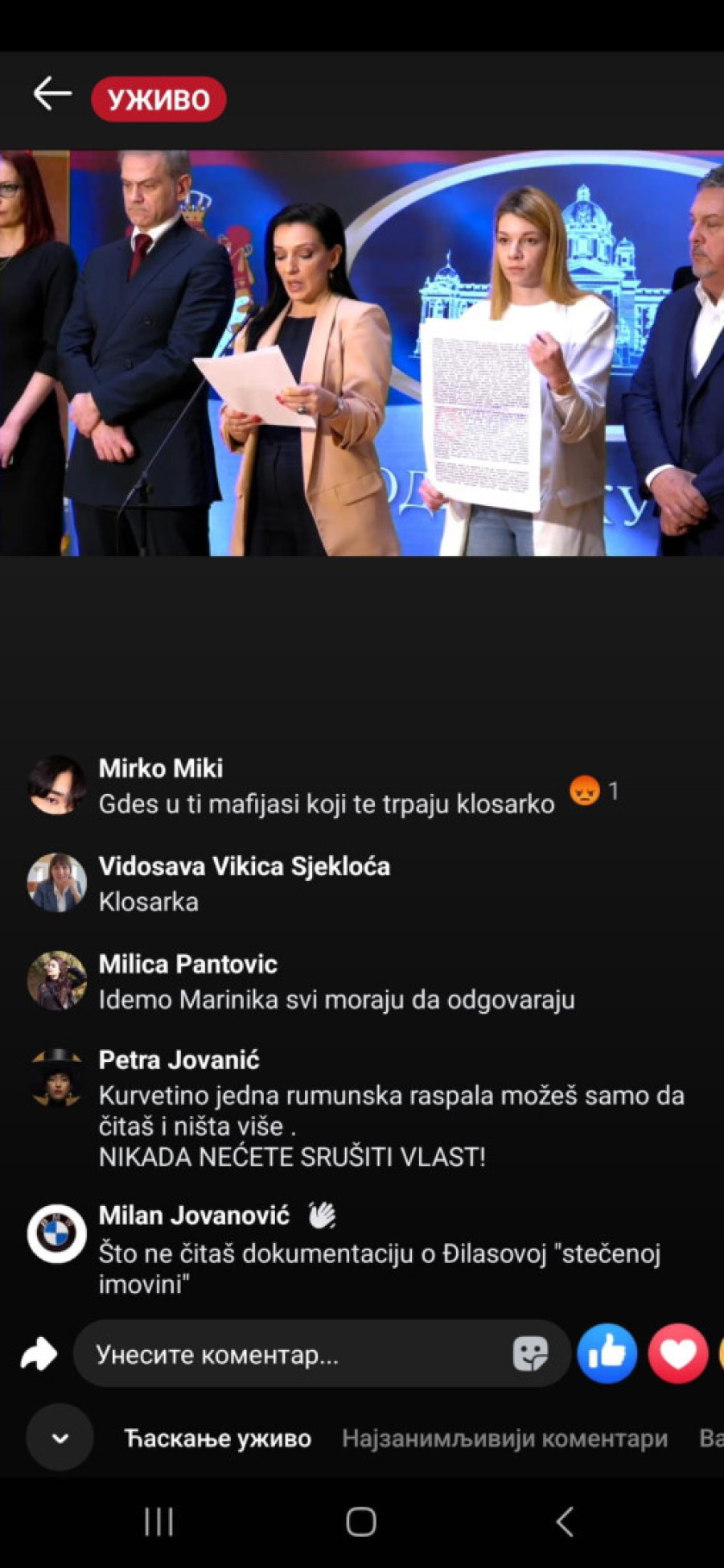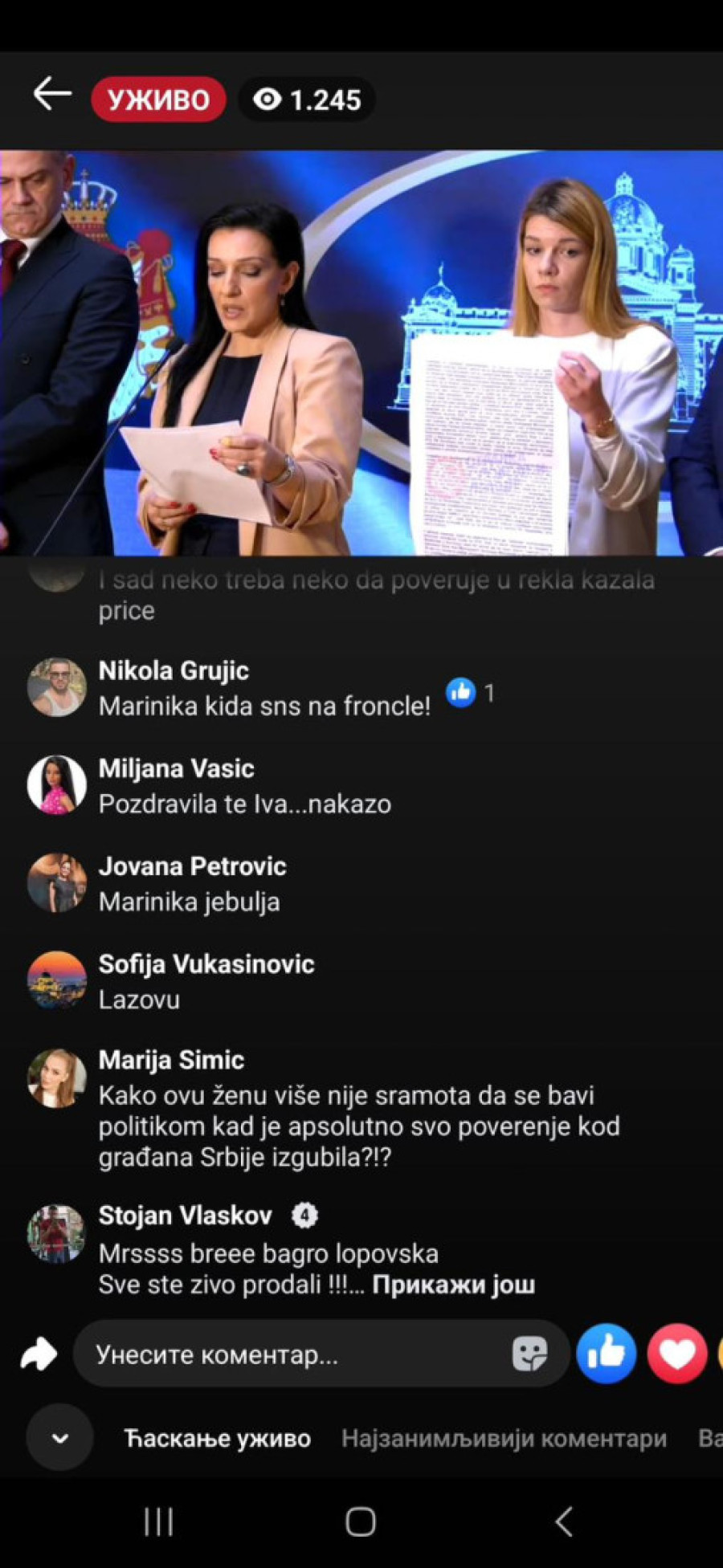 "Bednice, jadna li si, izgleda da te slabo ka*aju mafijaši, tvoji jeb*či ili mnogo patiš za mlitavim Đikijem", "Ma, ona bre ni u cirkusu ne bi mogla da čita dnevni red, a kamoli ovo što radi...udrigirana", "Posao im je da ovako pljuju, tako su mene terali, išla sam na te časove. Sekta", "Ona bolje usta da ne otvara koliko se smrad oseća", "Đubre jedno lažljivo", "Ti nekome da se obraćaš, kravo, gubi se iz Srbije, ološu", "Ništa nije veće i opasnije pokradeno i uništeno od tvog šefa", "Ko o čemu, Marinika o poštenju. Smešna si ženo više", "Marinika, jesi li dobila koji milion od onih 619", "Kako ovu ženu više nije sramota da se bavi politikom kad je apsolutno svo poverenje kod građana Srbije izgubila?", "Jedva čekam da te iza rešetaka vidim, ološu, ljigo jedna", "Još malo pa u ćorku za sav lopovluk!#" bili su samo neki od komentara u današnjem lajvu.