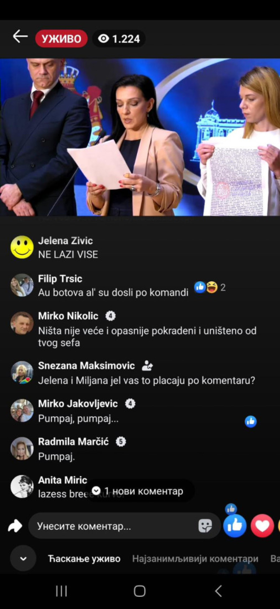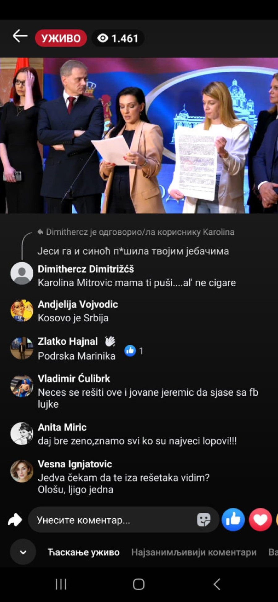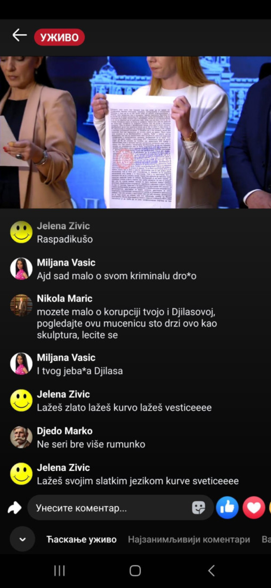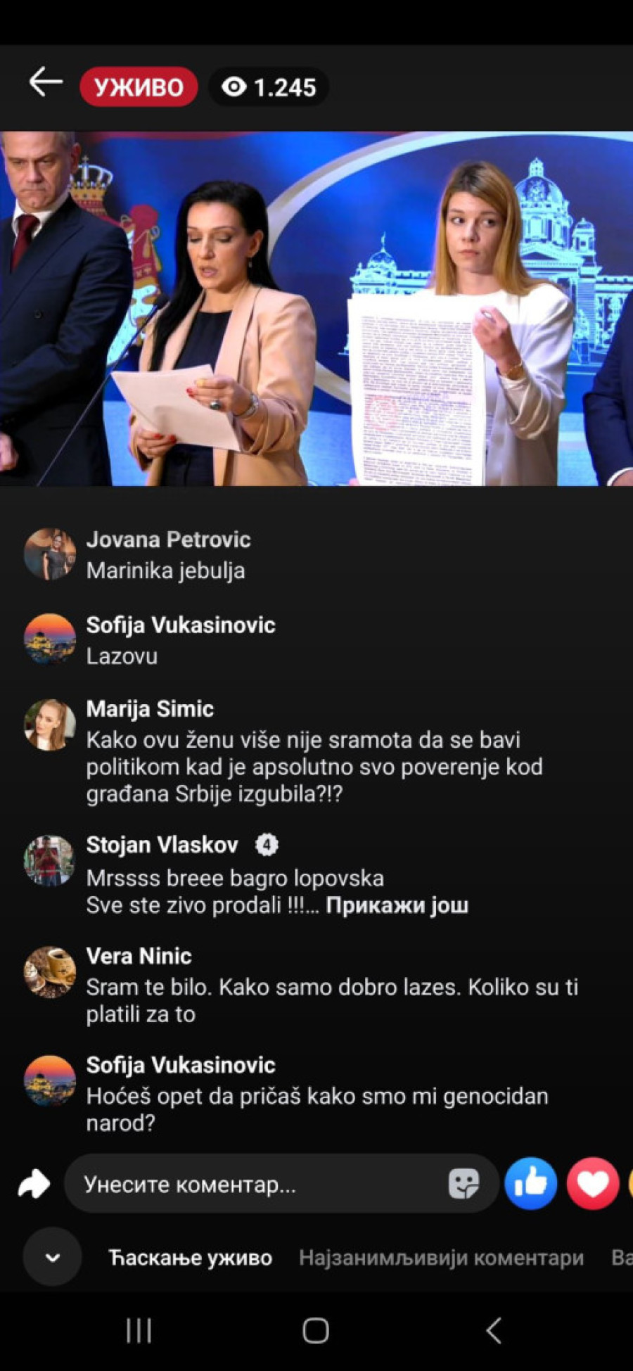 "Bednice, jadna li si, izgleda da te slabo ka*aju mafijaši, tvoji jeb*či ili mnogo patiš za mlitavim Đikijem", "Ma, ona bre ni u cirkusu ne bi mogla da čita dnevni red, a kamoli ovo što radi...udrigirana", "Posao im je da ovako pljuju, tako su mene terali, išla sam na te časove. Sekta", "Ona bolje usta da ne otvara koliko se smrad oseća", "Đubre jedno lažljivo", "Ti nekome da se obraćaš, kravo, gubi se iz Srbije, ološu", "Ništa nije veće i opasnije pokradeno i uništeno od tvog šefa", "Ko o čemu, Marinika o poštenju. Smešna si ženo više", "Marinika, jesi li dobila koji milion od onih 619", "Kako ovu ženu više nije sramota da se bavi politikom kad je apsolutno svo poverenje kod građana Srbije izgubila?", "Jedva čekam da te iza rešetaka vidim, ološu, ljigo jedna", "Još malo pa u ćorku za sav lopovluk!#" bili su samo neki od komentara u današnjem lajvu.