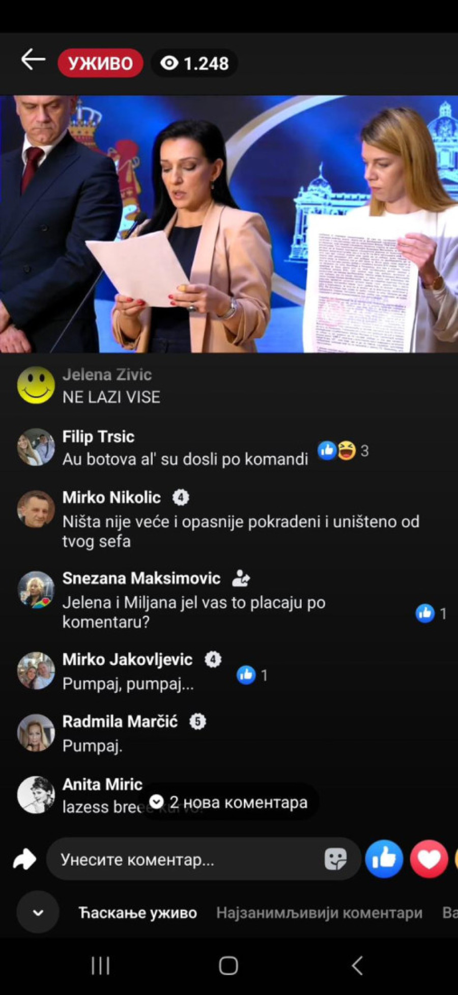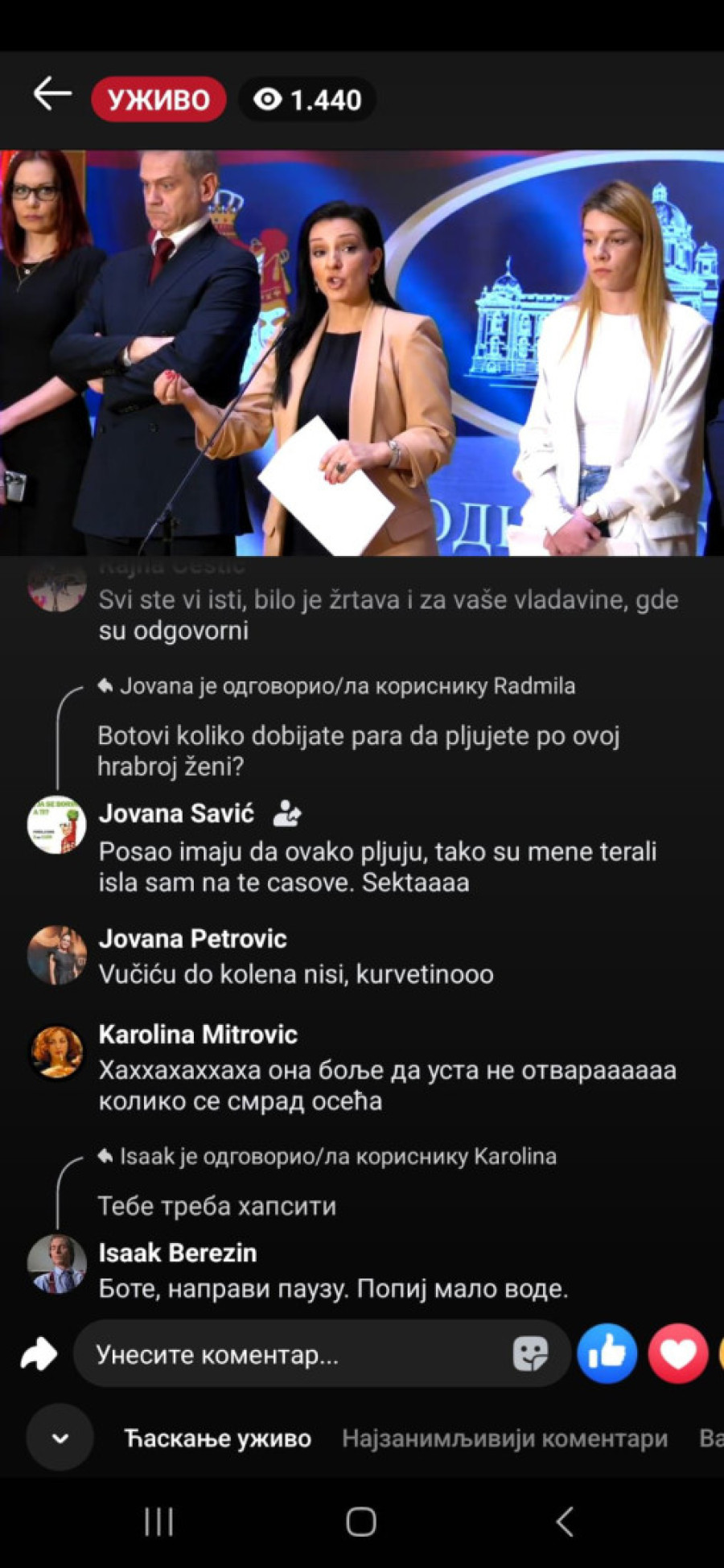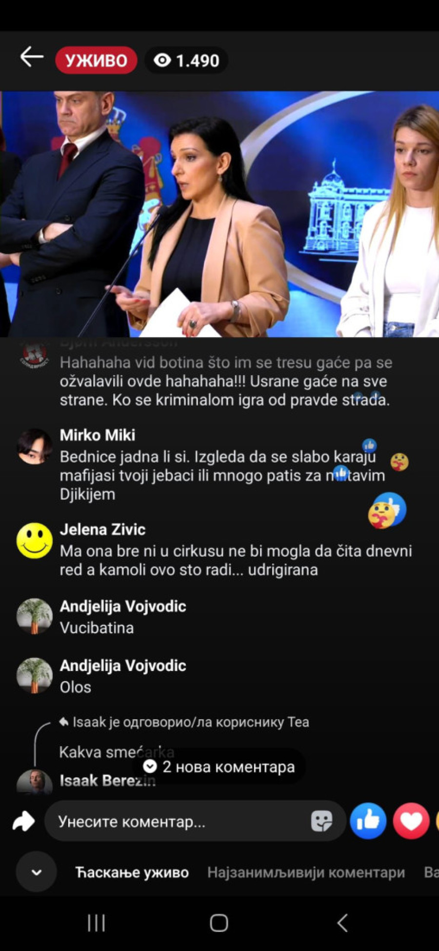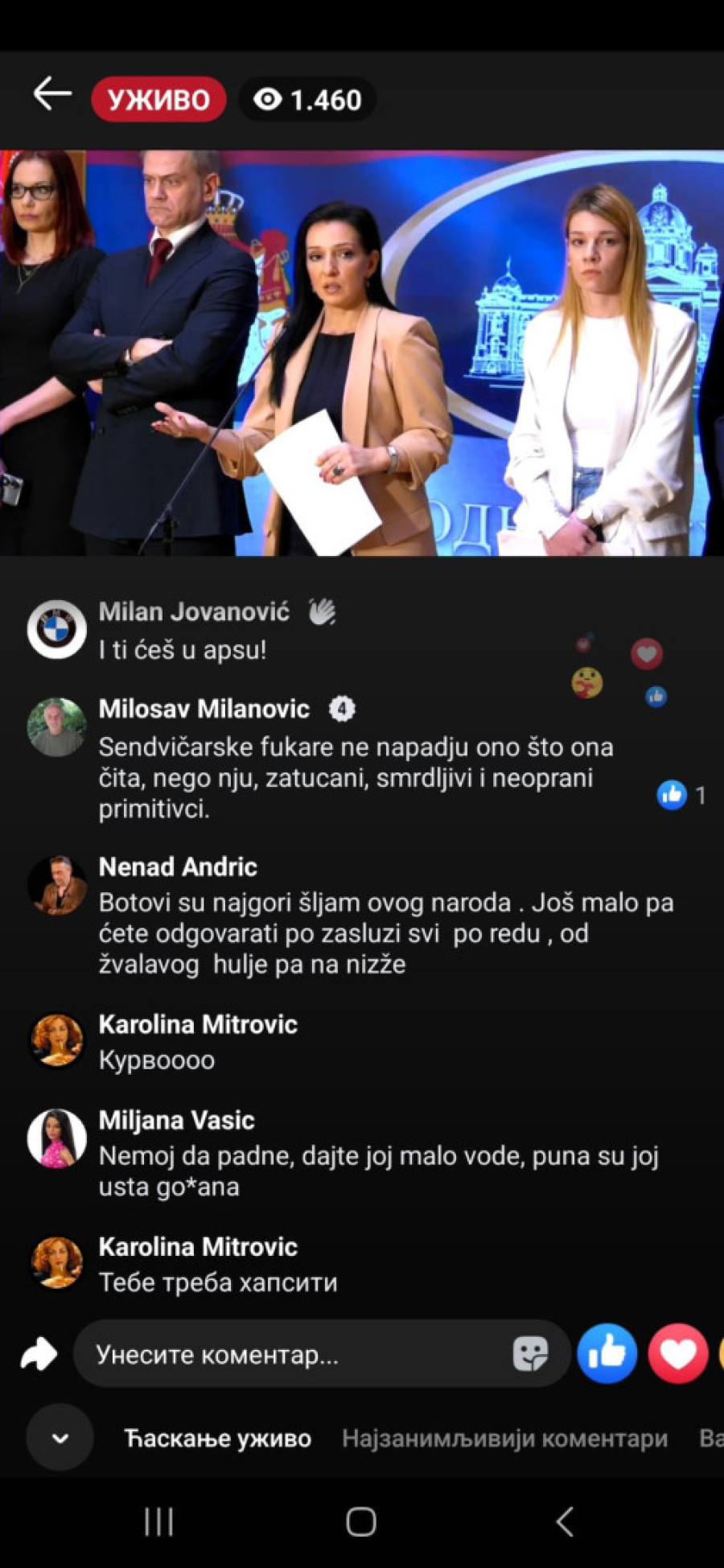"Bednice, jadna li si, izgleda da te slabo ka*aju mafijaši, tvoji jeb*či ili mnogo patiš za mlitavim Đikijem", "Ma, ona bre ni u cirkusu ne bi mogla da čita dnevni red, a kamoli ovo što radi...udrigirana", "Posao im je da ovako pljuju, tako su mene terali, išla sam na te časove. Sekta", "Ona bolje usta da ne otvara koliko se smrad oseća", "Đubre jedno lažljivo", "Ti nekome da se obraćaš, kravo, gubi se iz Srbije, ološu", "Ništa nije veće i opasnije pokradeno i uništeno od tvog šefa", "Ko o čemu, Marinika o poštenju. Smešna si ženo više", "Marinika, jesi li dobila koji milion od onih 619", "Kako ovu ženu više nije sramota da se bavi politikom kad je apsolutno svo poverenje kod građana Srbije izgubila?", "Jedva čekam da te iza rešetaka vidim, ološu, ljigo jedna", "Još malo pa u ćorku za sav lopovluk!#" bili su samo neki od komentara u današnjem lajvu.
