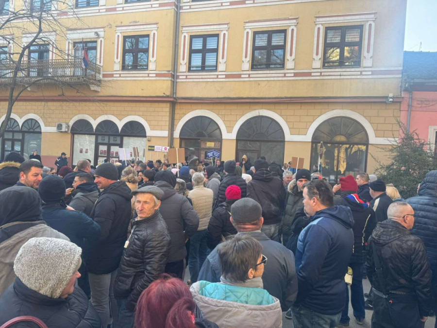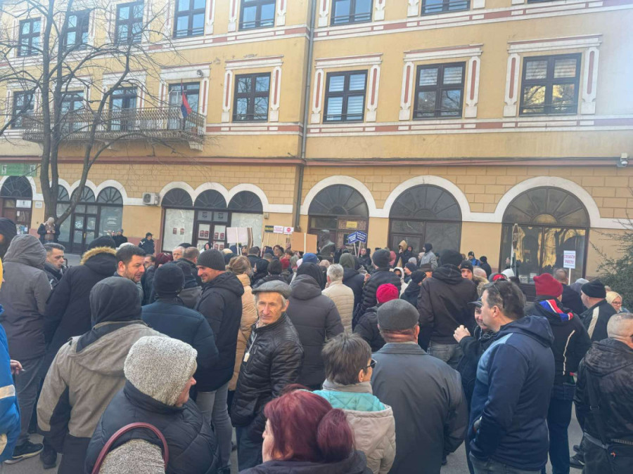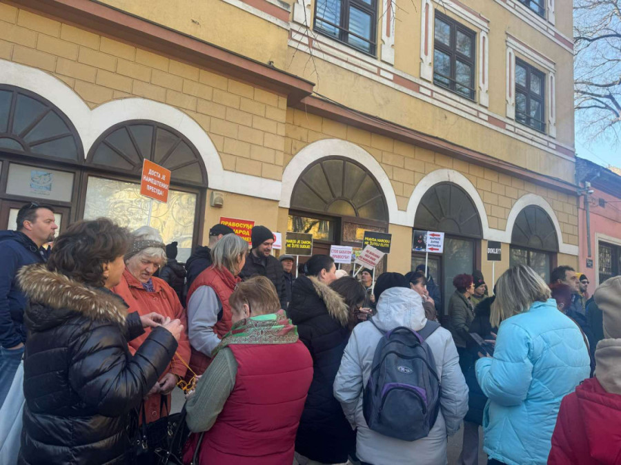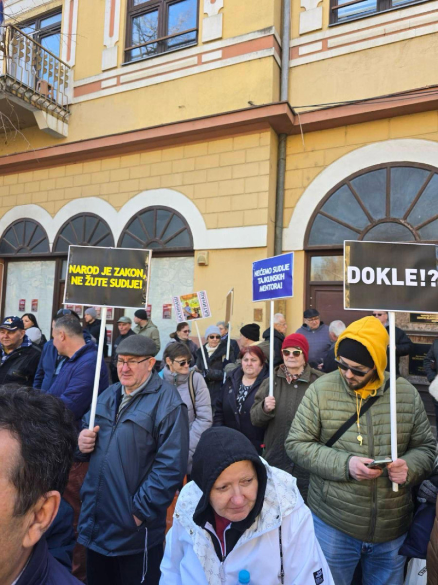 Ljudi su se okupili ispred zgrade suda, noseći transparente s parolama kao što su: "Hapsite žutog batinaša", "Pravosuđe za narod, ne tajkune"...