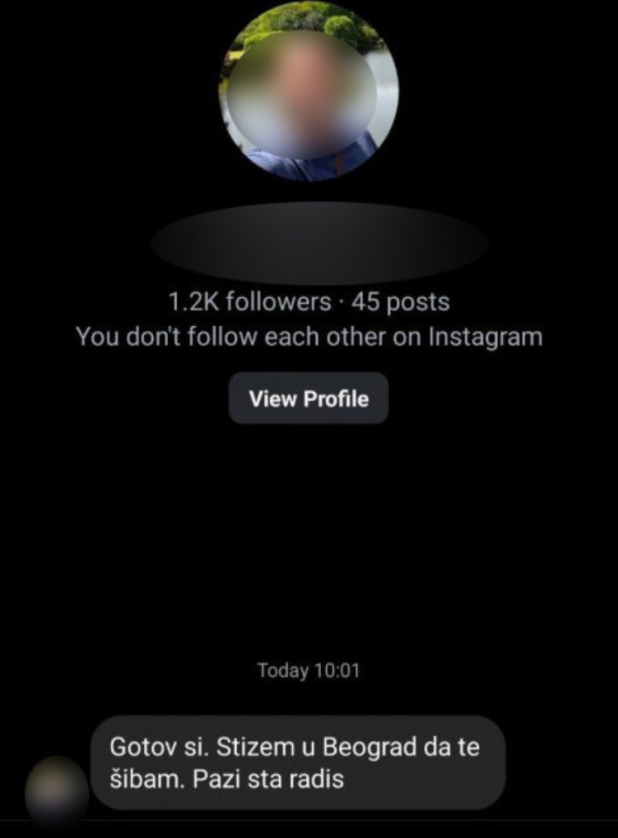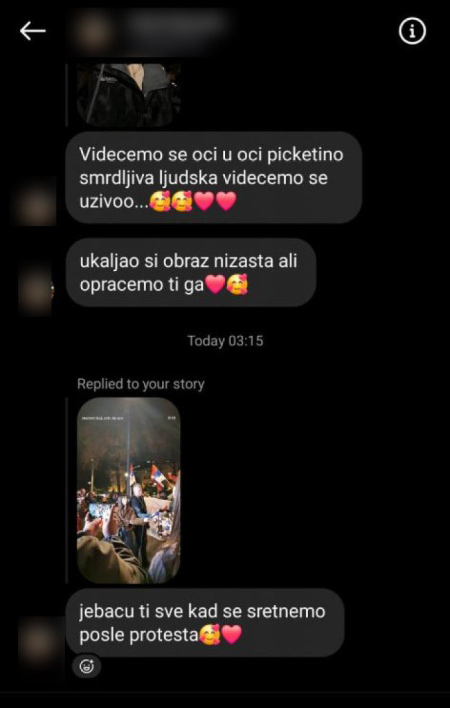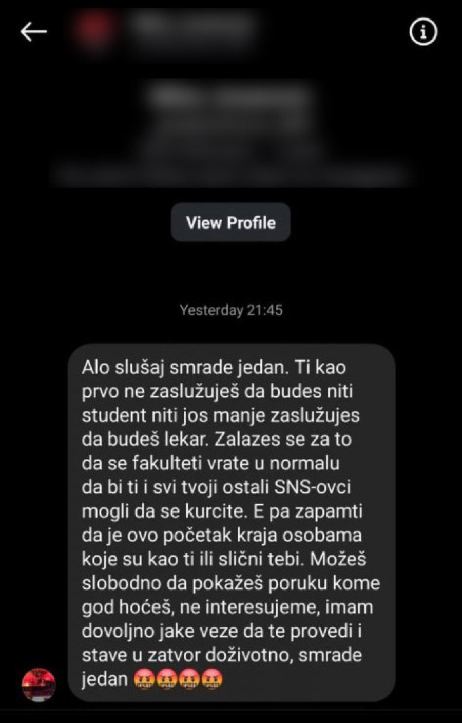 - Alo slušaj smrade jedan. Ti kao prvo ne zaslužuješ da budeš niti student niti još manje zaslužuješ da budeš lekar. Zalažeš se za to da se fakulteti vrate u normalu da bi ti i svi tvoji ostali SNS-ovci mogli da se kur*ite. E pa zapamti da je ovo početak kraja osobama koje su kao ti ili slični tebi. Možeš slobodno da pokažeš poruku kome god hoćeš, ne interesuje me, imam dovoljno jake veze da te provedu i stave u zatvor doživotno, smrade jedan 🤬🤬🤬🤬.