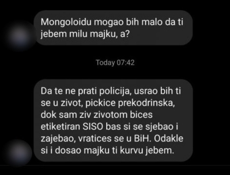 Smradu mali odvratni.. je*em ti majku koja te rodila i oca koji te napravio... Kako srama nemaš je*em ti sva kolena unazad a i unapred... go*no malo zvalavo da bog da crko kao poslednja džukela... majku ti je*em odvratnu... ja ne mogu da verujem da smeće i smrad kao ti može da postoji... je*em ti sve što imaš i nemaš , samo su nekee od poruka koje ovaj mladić svakodenvno dobija.