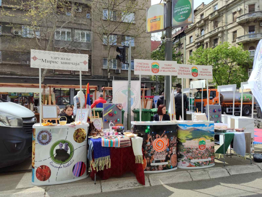 Kako javlja naš reporter, postavljeno je mnogo štandova na kojima ljudi iz svih krajeva Srbije prodaju proizvode i turističke atrakcije iz svojih krajeva.
