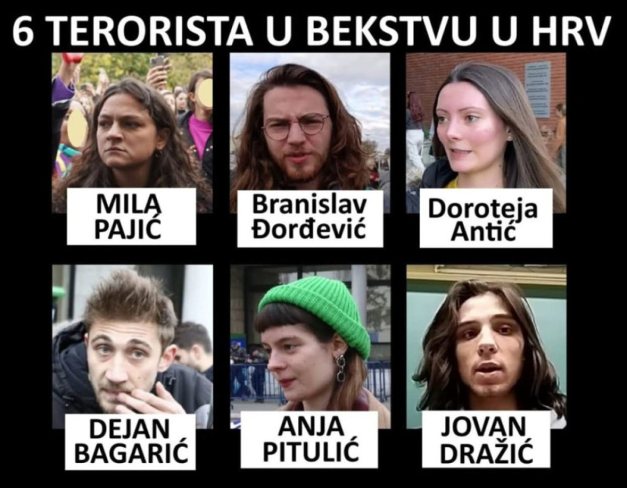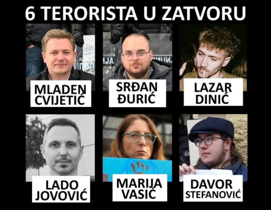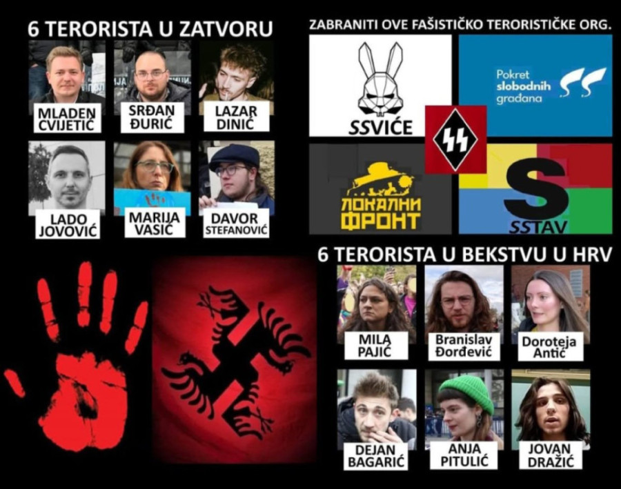 - Danas je teroristička opozicija napala policiju i sudove u Novom Sadu i Nišu! Zbog čega? Zbog ovih 6 terorista koji su u zatvoru i zbog 6 terorista koji su u bekstvu u Hrvatskoj! Opozicija zahteva da se teroristi odmah puste, da bi mogli da nastave da terorišu Srbiju! - kaže Bakarec.