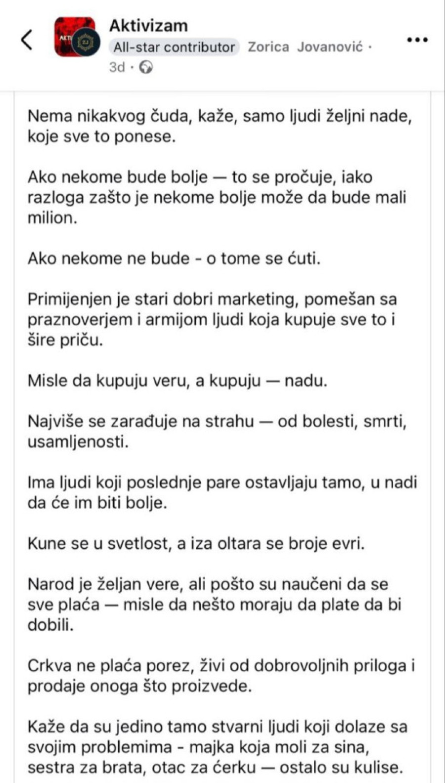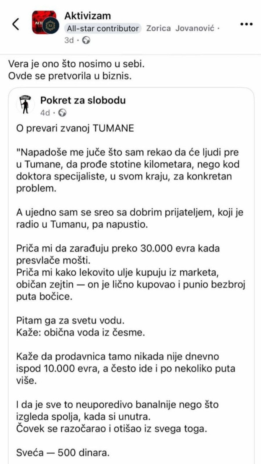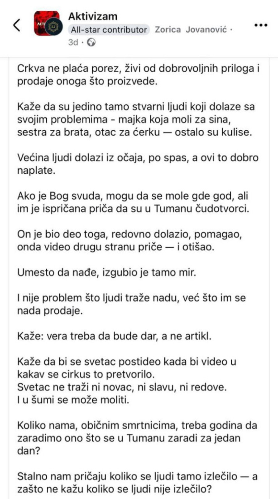 Naime, izvesni Stefan Simić koji se na društvenim mrežama predstavlja kao neko ko je studirao Filozofski fakultet u Beogradu, objavio je skandalozan tekst pod nazivom „Koliko košta vera? Tumane“.