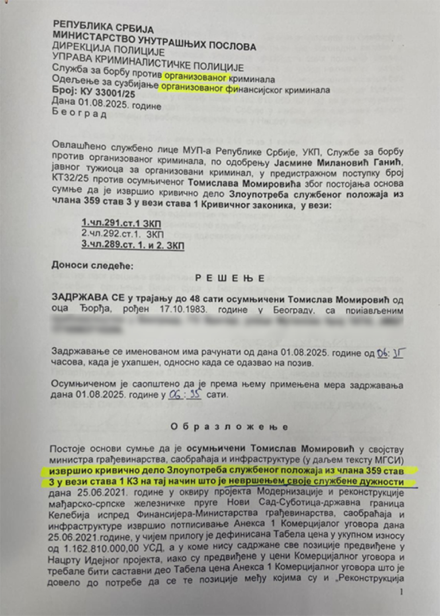 Na ovaj šokantan zaključak upućuje i obrazloženje rešenja kojim se Momiroviću određuje pritvor do 48 sati, a u kom doslovno stoji da se Momiroviću na teret stavlja krivično delo "Zloupotreba službenog položaja".