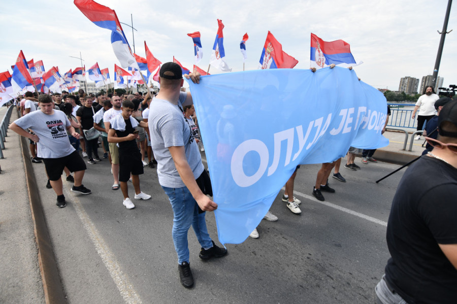 Veliki broj građana stigao je u Sremske Karlovce noseći zastave Srbije, a na čelu kolone je bio transparent "Oluja je genocid".
