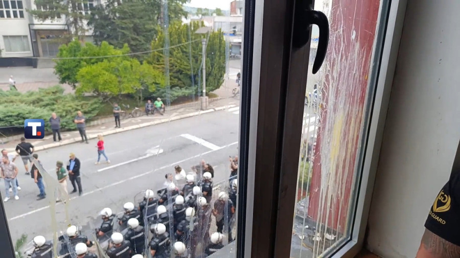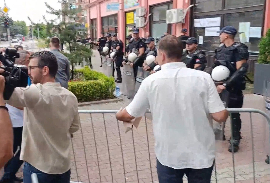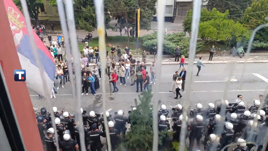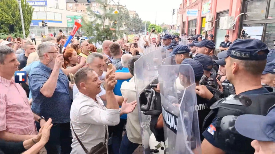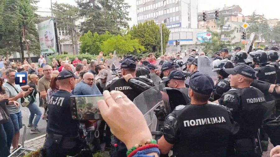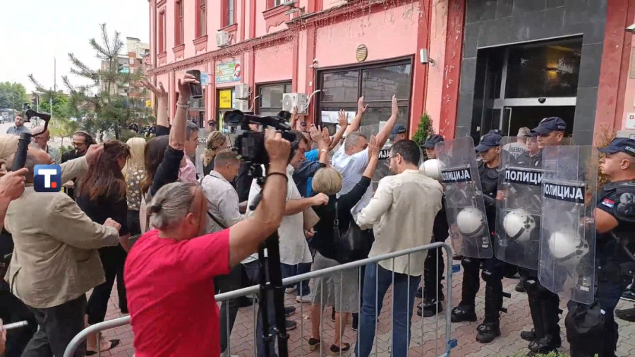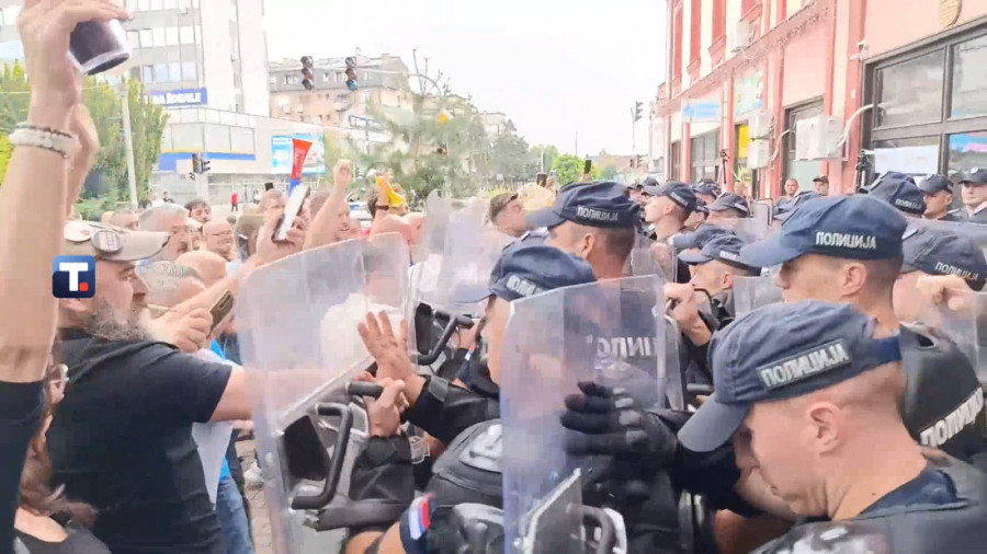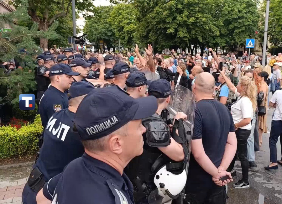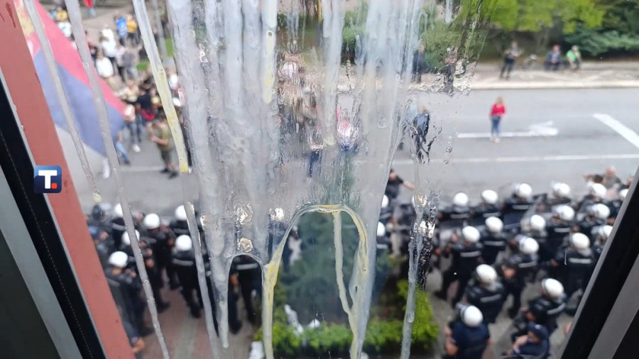 Policija i Žandarmerija formirali su gust kordon oko zgrade, dok okupljeni ponovo maltretiraju i narod i pripadnike MUP-a